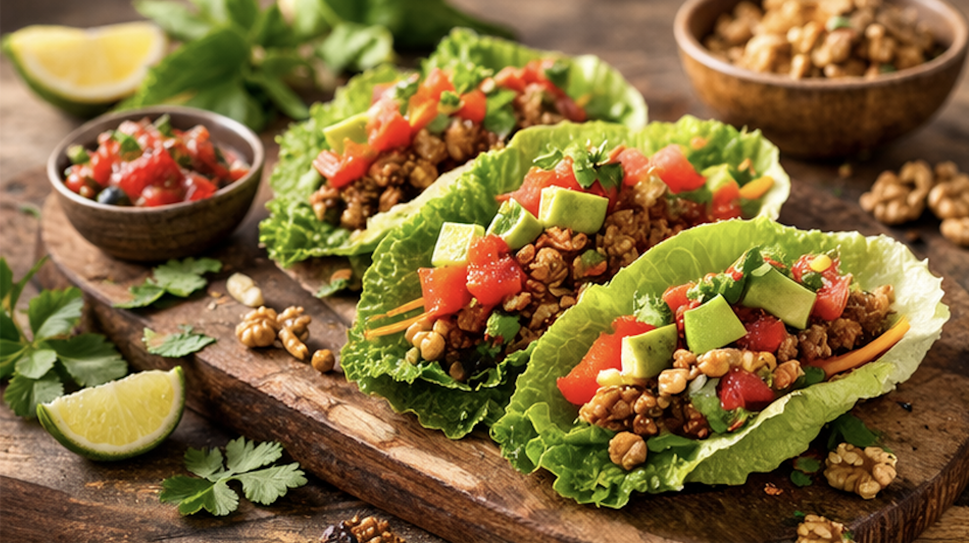 Crunchy, colourful, and full of bold flavour, these lettuce wrap tacos offer a refreshing and nourishing twist on a familiar favourite. The walnut filling provides plant-based protein and healthy fats, helping to support brain function and sustained energy. Fresh vegetables bring a satisfying crunch along with vitamins and antioxidants that boost overall wellness. Wrapped in crisp lettuce leaves, this dish is naturally light yet filling, making it perfect for clean eating without compromise. It’s a vibrant, energising meal that celebrates whole foods while delivering the comfort and enjoyment of classic taco flavours in a fresh, revitalising way.